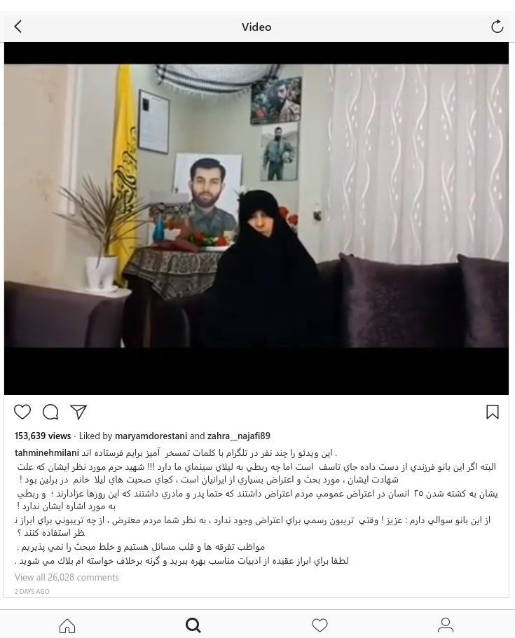 برخی از خانم ها و آقایان هموطن، از پست تهمینه میلانی در صفحه ی اینستاگرام اش، و جمله ی او در باره ی شهدای مدافع حرم ناراحت شده اند.