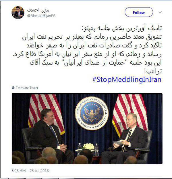 همچنین وزیر خارجه آمریکا بار دیگر سخنان و مواضع ضد ایرانی خود را تکرار کرد و گفت: سال آینده چهلمین سالگرد انقلاب ایران خواهد بود. چهل سال است که ایران از تروریسم حمایت کرده و میکند. آمریکا از مردم ایران حمایت میکند. ما فشار حداکثری اقتصادی بر ایران وارد میکنیم و در صورت تغییر رفتار ایران با این کشور مذاکره میکنیم.