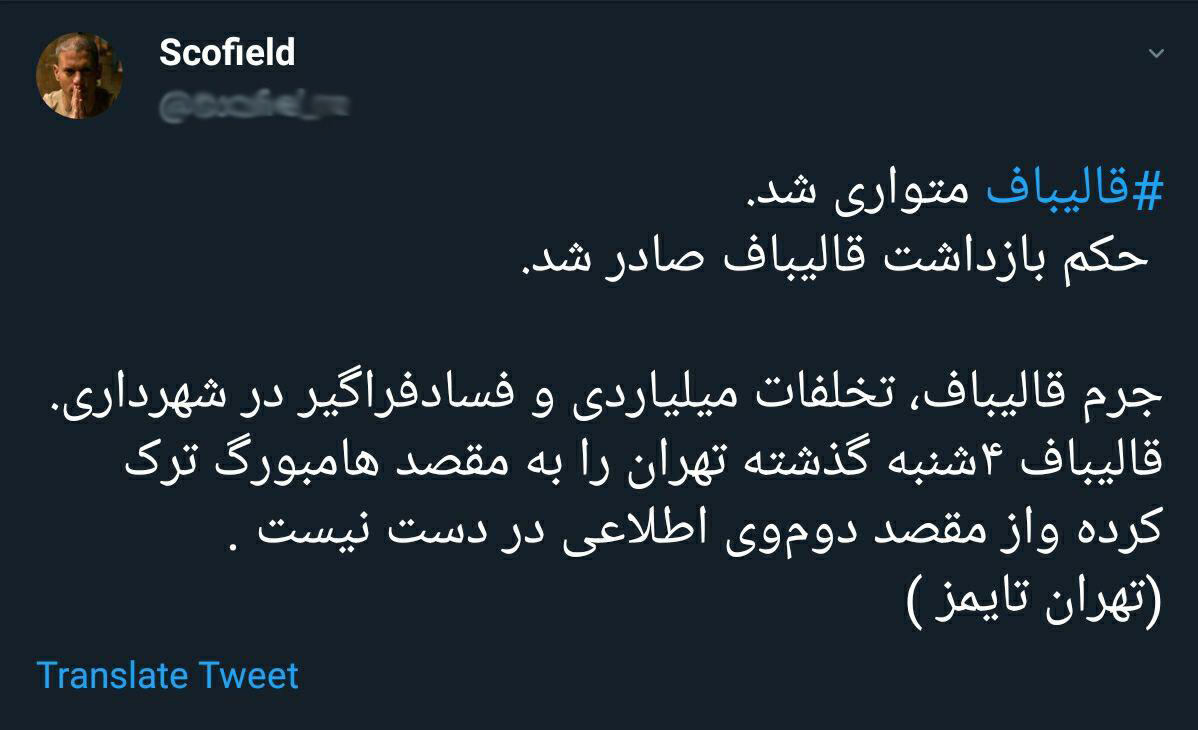 وقتی تیر معاندین در قضیه حضور قالیباف در هامبورگ به سنگ خورد آنها برای لاپوشانی دروغ قبلی خود به یک خبر دروغ دیگر در مورد این شخص روی آورده و از خروج قالیباف از کشور خبر دادند!