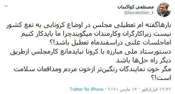 متن توئیت مصطفی کواکبیان عضو هیات رئیسه فراکسیون امید مجلس به این شرح است: «بارها گفته ام تعطیلی مجلس در اوضاع کرونایی به نفع کشور نیست؛ زیرا کارگران و کارمندان میگویند چرا ما باید کار کنیم اما جلسات علنی در اسفند ماه تعطیل باشد!؟