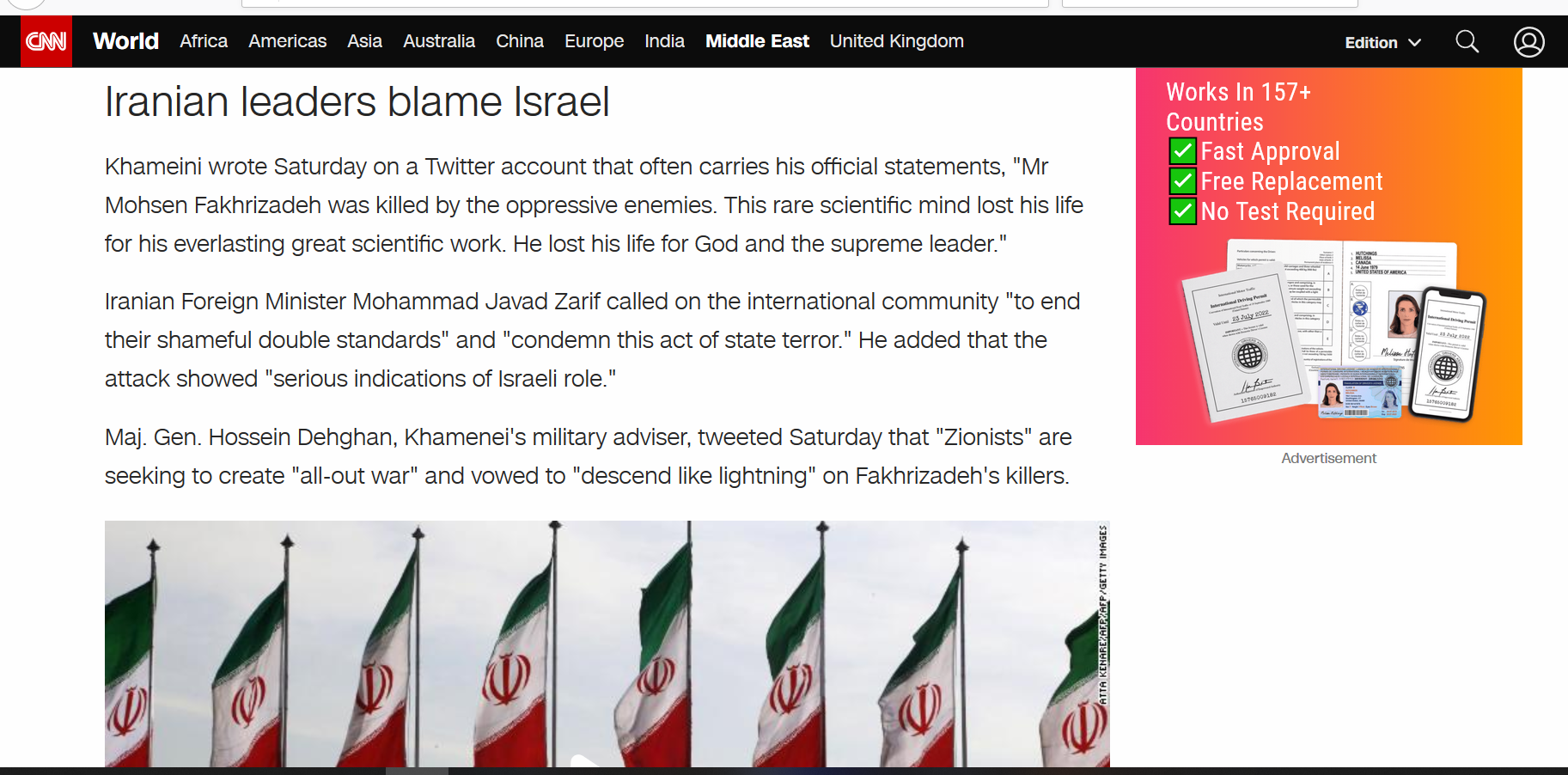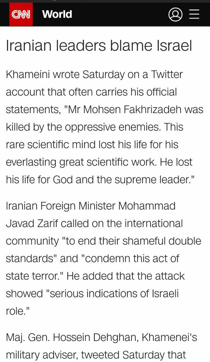 به گزارش الف این شبکه خبری مشهور آمریکایی که نزدیک به دموکرات ها نیز هست در مطلبی که به قلمِ الیوت مک لاگلین و سارا مظلومساکی نوشته شده است و رامین مستقیم، آنگلا دوان، و سامانتا بیچ هم در تدوین آن مشارکت کرده اند (اینجا) مدعی شد آیت الله خامنه ای در توییت خود گفته است، دانشمند هسته ای ایران جانش را برای رهبر معظم انقلاب فدا کرده! این در حالی است که در پیام کوتاه رهبر انقلاب هیچ اثری از این جمله یا چنین معنایی دیده نمی شود.