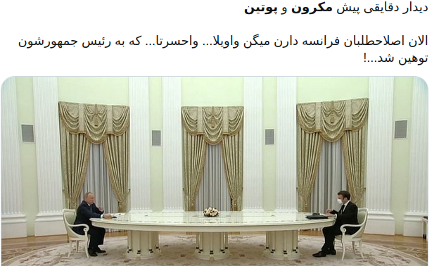 محسن ماندگاری نیز نوشت : تصاویر دیدار مکرون و پوتین باعث شده طرفداران آ.رئیسی شاهدی یافته باشند که پس دیدار ایشان با پوتین هم طبق عرف دیپلماتیک و محترمانه بوده. این در حالیست که "سفر کاری" مکرون به مسکو و نشستن در دوسر آن میز کذایی،حتی فرانسویها را نیز شوک زده کرده و باانتقاد و استهزای رسانه ها مواجه شده است .