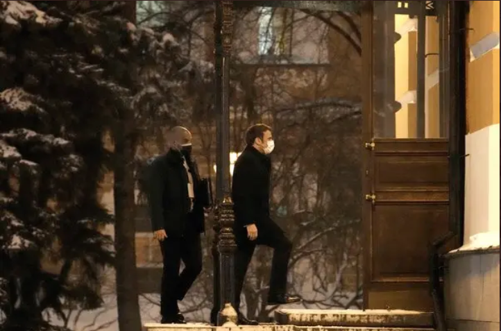 اینهم لحظه ورود مکرون به کاخ پوتین / پوتین در اتاق مشهور منتظر دیدار است .
