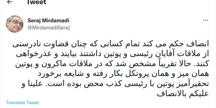 سرراج الدین میردامادی (اصلاح طلب و عضو سابق دفتر تحکیم وحدت نیز چنین نوشت :انصاف حکم می کند تمام کسانی که چنان قضاوت نادرستی از ملاقات آقایان رئیسی و پوتین داشتند بیایند و عذرخواهی کنند. حالا تقریباً مشخص شد که در ملاقات ماکرون و پوتین همان میز و همان پروتکل بکار رفته و شایعه برخورد تحقیرآمیز پوتین با رئیسی کذب محض بوده است. علینا و علیکم بالانصاف