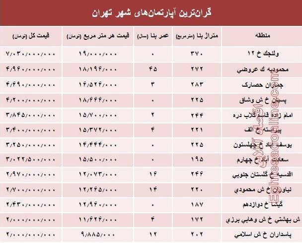 گروه اقتصادی الف، 3961214142در جدول زیر شاهد معاملات انجام شده آپارتمانهای گران در شمال تهران هستید که این ارقام مربوط به اعلام سامانه اطلاعات بازار املاک ایران میباشد.