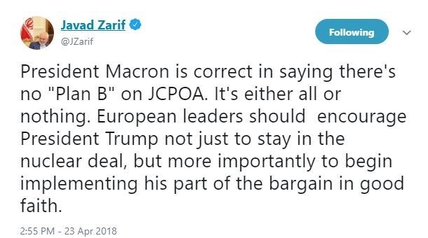 محمد جواد ظریف، وزیر امور خارجه کشورمان امروز در پیامی توئیتری نسبت به برخی اظهارات مقامات غربی درباره سرنوشت، تصریح کرد که هیچ طرح جایگزینی برای برجام نیست و کشورهای اروپایی باید ترامپ را به آغاز اجرای تعهدات آمریکا تشویق کنند. ظریف نوشت: رئیس جمهور ماکرون درست میگوید که هیچ «طرح جایگزینی» برای برجام وجود ندارد. یا همه یا هیچ. رهبران اروپایی نهتنها باید رئیس جمهور ترامپ را به ماندن در توافق هستهای تشویق کننند، بلکه مهمتر از آن [وی را] به آغاز اجرای همراه با حسن نیت بخش [مربوط به] خود تشویق کنند.