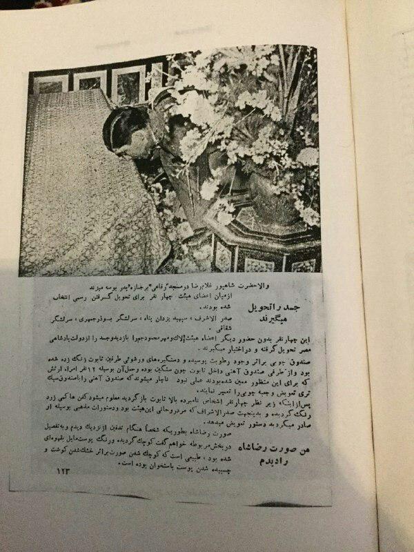 یقینم به دلیلی خیلی روشن و ساده بود: جسد را کاملاً شبیه به عکس معروف جنازه رضا شاه در تابوت بازسازی کرده و عکس آن را منتشر کرده بودند بدون توجه به اینکه جنازه باید طبق آداب شرعی اسلامی تکفین و تدفین شده باشد. حتی آستین پیراهن در عکس نیز شبیه به عکس تابوت بود یعنی همان عکس جنازه رضا شاه که قبل از مراسم تکفین بعنوان یادگاری در قاهره گرفته شده بود.