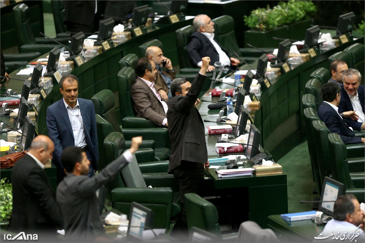 برخی نمایندگان نیز همزمان با این شعار، با حضور در جایگاه ناطقان، پرچم آمریکا و نسخهای از برجام را آتش زدند.