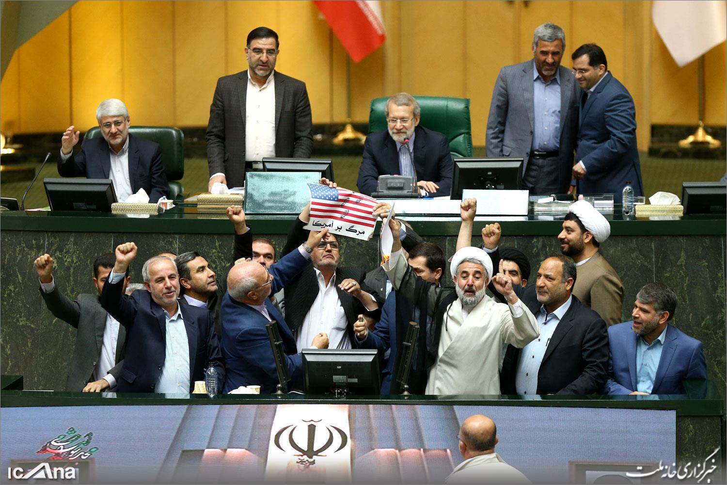 همزمان با آغاز جلسه علنی مجلس شورای اسلامی، نمایندگان مردم در خانه ملت در واکنش به اقدام شب گذشته رئیسجمهور آمریکا در اعلام خروج از برجام، شعار «مرگ بر آمریکا» سر دادند.
