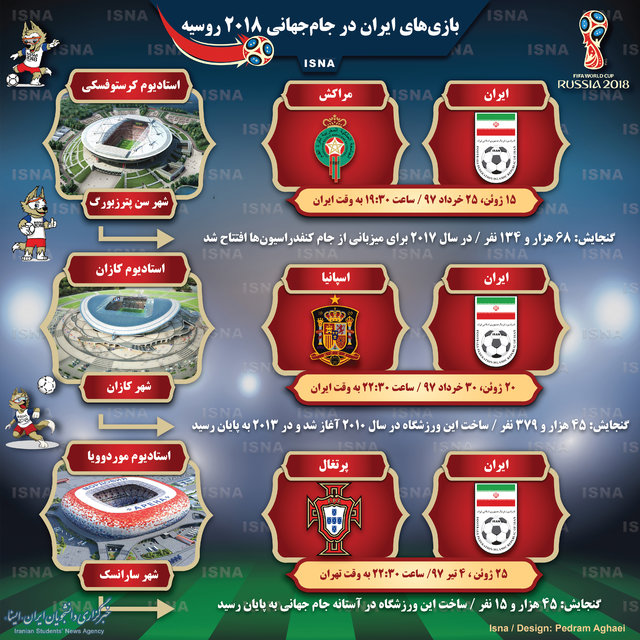 گروه ورزشی الف، 3970324067تیم ملی فوتبال ایران در جام جهانی ۲۰۱۸ روسیه قرار است با تیمهای مراکش، اسپانیا و پرتغال دیدار کند. در این اینفوگرافی، به تاریخ بازیهای ایران و ورزشگاههایی که قرار است در آنها بازی کند نگاهی انداختهایم.