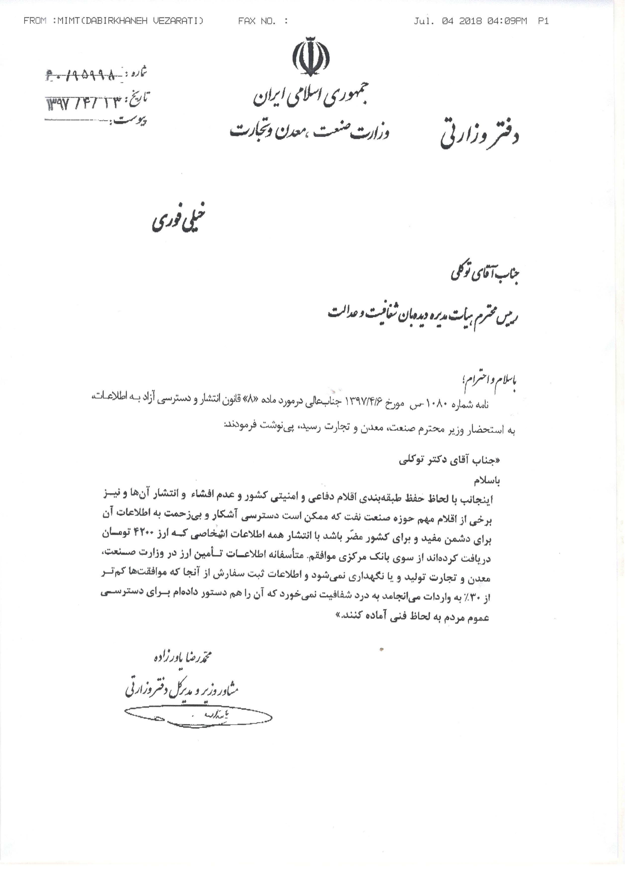 حسب الزام ماده 8 قانون انتشار و دسترسی آزاد به اطلاعات دستور فرمایید اطلاعات کامل (شامل متقاضی، میزان، میزان درخواست، بانک عامل، تاریخ) ثبت سفارش از روز سه شنبه 21/01/1396 تا روز قبل از ارسال پاسخ این نامه حداکثر طی 10 روز برای دیده بان شفافیت و عدالت ارسال نمایند.