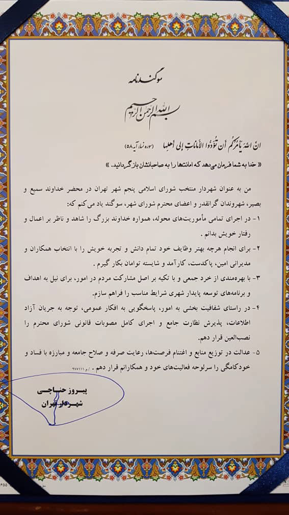 من به عنوان شهردار منتخب شورای اسلامی پنجم در محضر خداوند سمیع و بصیر، شهروندان گرانقدر و اعضای محترم سوگند یاد می کنم که در اجرای تمام ماموریتهای محول همواره خدا را شاهد و ناظر بر اعمال خویش بدانم.