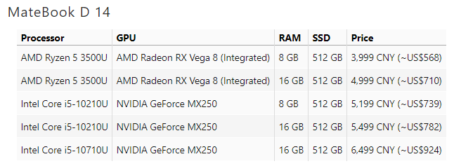 لپتاپهای جدید هوآوی سری Matebook D در دو مدل ۱۴ و ۱۵ اینچی که به ترتیب ۲۵۶ و ۵۱۲ گیگابایت فضای ذخیرهسازی داخلی دارند، معرفی شدند. بهروزرسانیهای قابل توجه در این دو محصول، استفاده از پردازندههای AMD Ryzen 5 3500U در مقایسه با مدل AMD Ryzen 2500U است. در حالی که پردازشگر گرافیکی Radeon RX Vega 8 نیز در این دو محصول استفاده شده.