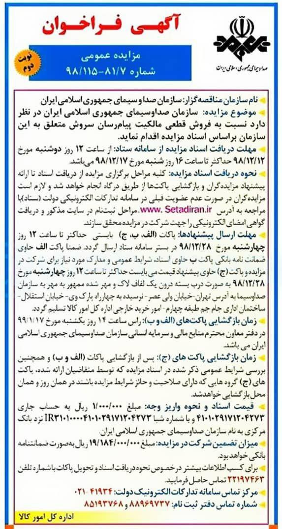 متقاضیان تا 28 اسفند فرصت دارند پیشنهادهای خرید خود را ارسال و پاکتهای ارسالی در روز 17 فروردین 99 طی تشریفاتی باز خواهد شد.
