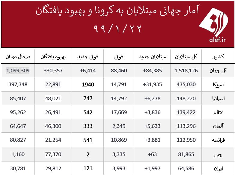 گروه سلامت الف، 3990122001این روزها ویروس کرونا در اغلب کشورهای جهان در حال گسترش است و تکاپویی جهانی برای کنترل آن شکل گرفته است. شما می توانید هر روز در جدول زیر روند ابتلا به این بیماری و بهبود آن را در کشورهای مختلف ببینید. جدول زیر متعلق به ۲۲ فروردین است.