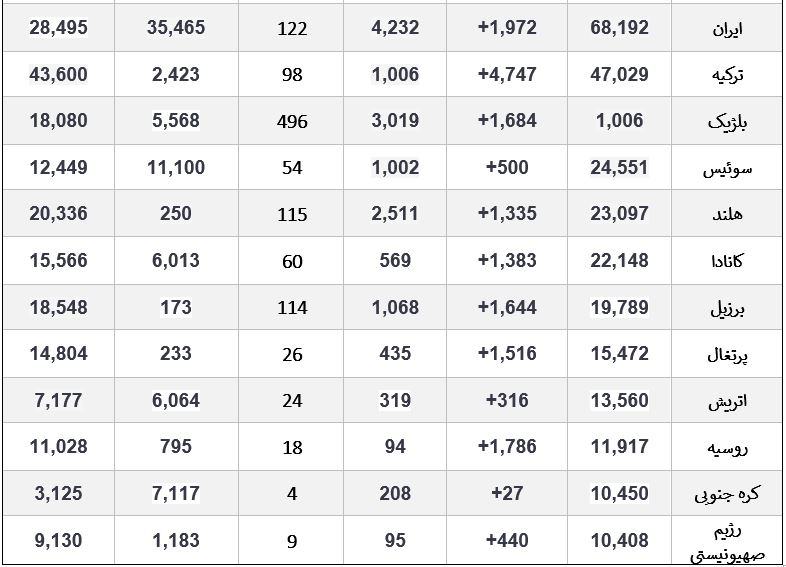 گروه سلامت الف، 3990123034این روزها ویروس کرونا در اغلب کشورهای جهان در حال گسترش است و تکاپویی جهانی برای کنترل آن شکل گرفته است. شما می توانید هر روز در جدول زیر روند ابتلا به این بیماری و بهبود آن را در کشورهای مختلف ببینید. جدول زیر متعلق به ۲۳ فروردین است.