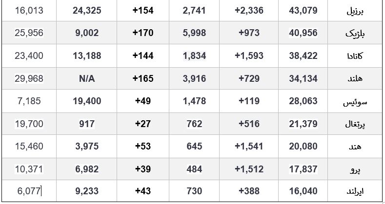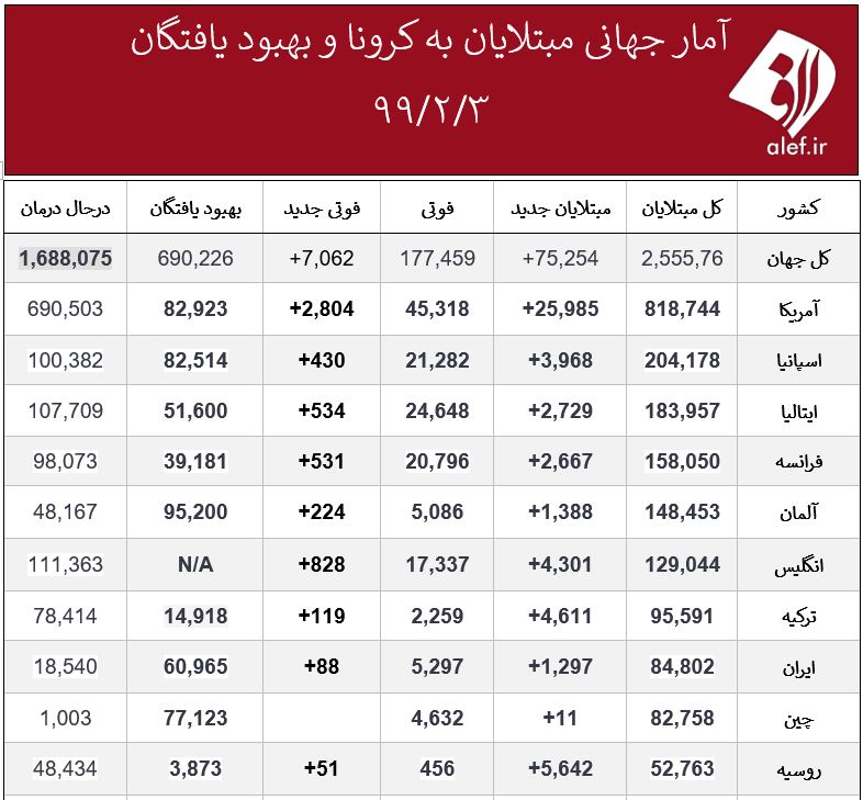 گروه سلامت الف، 3990203040این روزها ویروس کرونا در اغلب کشورهای جهان در حال گسترش است و تکاپویی جهانی برای کنترل آن شکل گرفته است. شما می توانید هر روز در جدول زیر روند ابتلا به این بیماری و بهبود آن را در کشورهای مختلف ببینید. جدول زیر متعلق به ۳ اردیبهشت است.