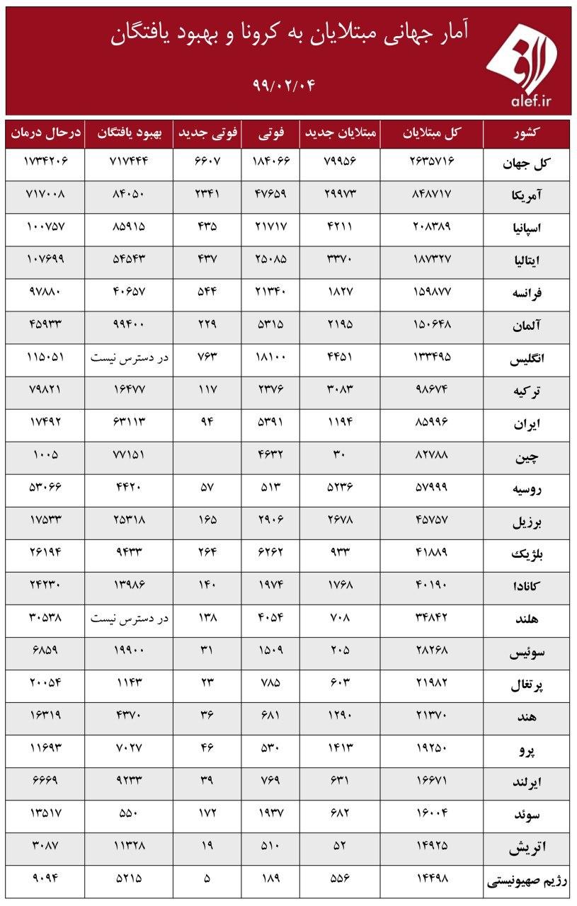 گروه اجتماعی الف، 3990204044ویروس کرونا در اروپا و آمریکا همچنان قربانی می گیرد. شما می توانید هر روز در جدول زیر روند ابتلا به این بیماری و بهبود آن را در کشورهای مختلف ببینید. جدول زیر متعلق به ۴ اردیبهشت است.