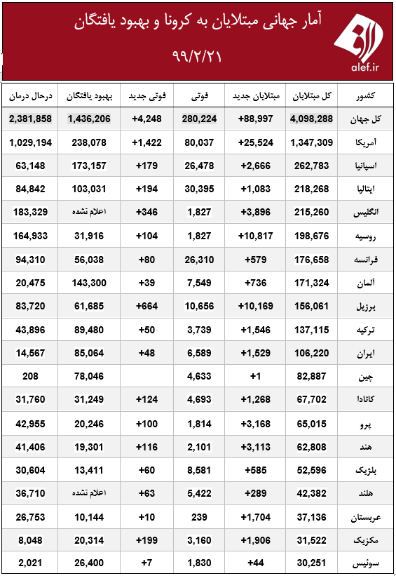 گروه سلامت الف، 3990221037این روزها ویروس کرونا در اغلب کشورهای جهان در حال گسترش است و تکاپویی جهانی برای کنترل آن شکل گرفته است. شما می توانید هر روز در جدول زیر روند ابتلا به این بیماری و بهبود آن را در کشورهای مختلف ببینید. جدول زیر آمار منتشر شده تا روز ۲۱ اردیبهشت است.