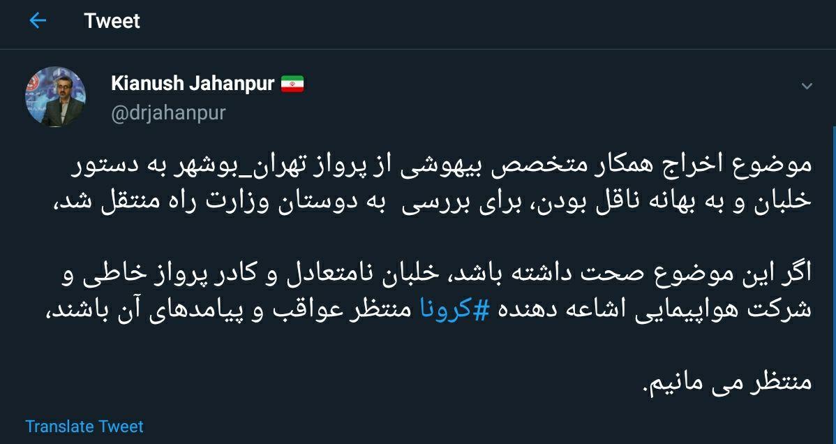 تهدید خلبان و کادر پروازی «تهران-بوشهر» توسط سخنگوی وزارت بهداشت