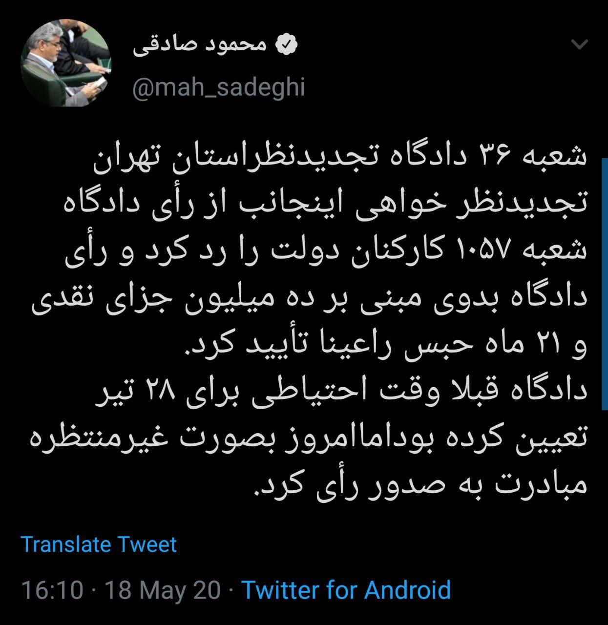 گروه سیاسی الف، 3990229139 ۱ نظر، ۰ در صف انتشار و ۳ تکراری یا غیرقابل انتشارمحمود صادقی نماینده مردم تهران در مجلس شورای اسلامی در صفحه شخصی خود در توئیتر خود مطلبی درباره حکمش منتشر کرد و نوشت: شعبه ۳۶ دادگاه تجدیدنظراستان تهران تجدیدنظر خواهی اینجانب از رأی دادگاه شعبه ۱۰۵۷ کارکنان دولت را رد کرد و رأی دادگاه بدوی مبنی بر ده میلیون جزای نقدی و ۲۱ ماه حبس را عینا تأیید کرد.