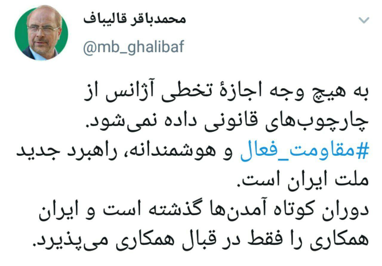 گروه سیاسی الف، 3990401124 ۱ نظر، ۰ در صف انتشار و ۳ تکراری یا غیرقابل انتشاررئیس مجلس شورای اسلامی طی توئیتی نوشت: به هیچ وجه اجازه تخطی آژانس از چارچوبهای قانونی داده نمیشود. مقاومت فعال و هوشمندانه، راهبرد جدید ملت ایران است. دوران کوتاه آمدنها گذشته است و ایران همکاری را فقط در قبال همکاری میپذیرد.