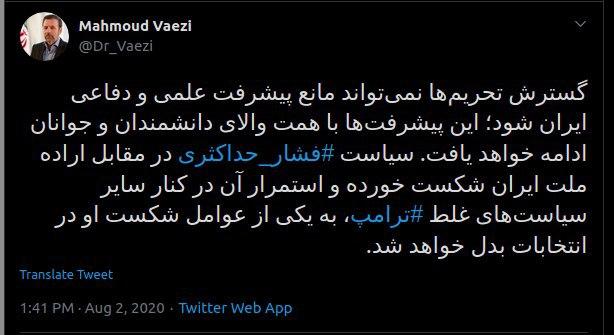 گروه سیاسی الف، 3990512137محمود واعظی رئیس دفتر رییس جمهوری در توئیتی نوشت: «گسترش تحریمها نمیتواند مانع پیشرفت علمی و دفاعی ایران شود؛ این پیشرفتها با همت والای دانشمندان و جوانان ادامه خواهد یافت. سیاست فشار حداکثری در مقابل اراده ملت ایران شکست خورده و استمرار آن در کنار سایر سیاستهای غلط ترامپ، به یکی از عوامل شکست او در انتخابات بدل خواهد شد.»