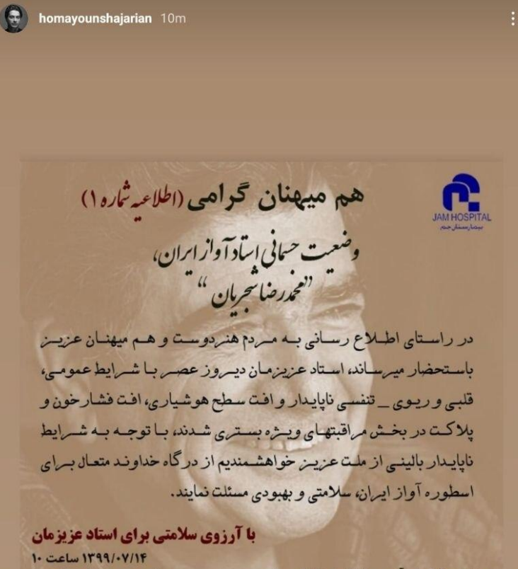 مهرداد بهلولی، عضو تیم پزشکی بررسی وضعیت محمدرضا شجریان در گفتوگو با باشگاه خبرنگاران جوان، در خصوص بستری محمدرضا شجریان خواننده مطرح کشورمان به دلیل مشکلات قلبی، گفت: شب گذشته استاد شجریان با وضعیت بسیار بد و با کاهش فشار خون و عفونت شدید در ناحیه بدن و کیسه صفرا به بیمارستان جم تهران منتقل شد و در حال حاضر در بخش ICU بستری است.