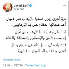 گروه سیاسی الف، 3990908011وزیر خارجه کشورمان در پی شهادت شهید محسن فخری زاده رئیس سازمان پژوهش و نوآوری وزارت دفاع در توئیتی به زبان عربی نوشت: ایران یک بار دیگر قربانی عملیات تروریستی شد و یکی از دانشمندان برنامه صلح آمیز کشورمان توسط تروریستها به شهادت رسید. سالیان درازی است قهرمانان کشورم برای ثبات و استقرار منطقه و جهان با تروریستها مبارزه میکنند. شهادت در راه حق، هنر مردان خداست و مجازات ظالمان، سنت الهی است.
