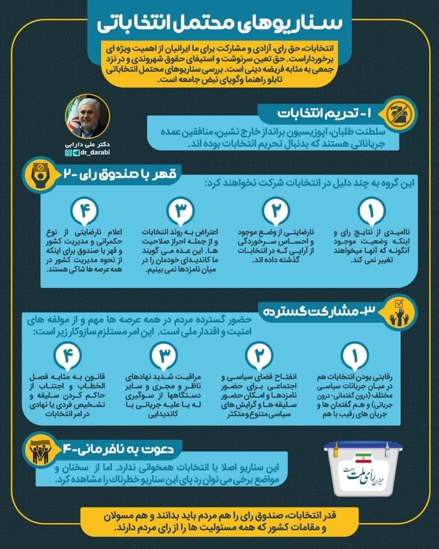 *در يك دسته بندى كلى اهم سناريوهاى محتمل انتخابات ١٤٠٠ رامى توان بشرح زير بيان كرد؛