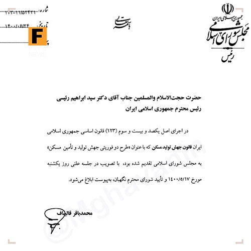 به گزارش ایسنا، محمدباقر قالیباف رئیس مجلس شورای اسلامی در نامهای خطاب به حجت الاسلام والمسلمین سید ابراهیم رئیسی، رئیس جمهور، «قانون جهش تولید مسکن» را ابلاغ کرد.