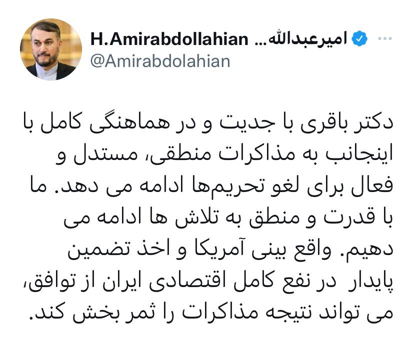 وزیر خارجه ایران: باقری با جدیت و در هماهنگی کامل با من به مذاکرات منطقی، مستدل و فعال برای لغو تحریمها ادامه میدهد.