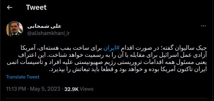این اظهارات سالیوان با واکنش دبیر شورای عالی امنیت ملی ایران روبرو شد. علی شمخانی دبیر شورای عالی امنیت ملی در همین خصوص امشب (جمعه) ۱۵ اردیبهشت ماه در توئیتر نوشت: جیک سالیوان گفته، در صورت اقدام ایران برای ساخت بمب هستهای، آمریکا آزادی عمل اسرائیل برای مقابله با آن را به رسمیت خواهد شناخت.