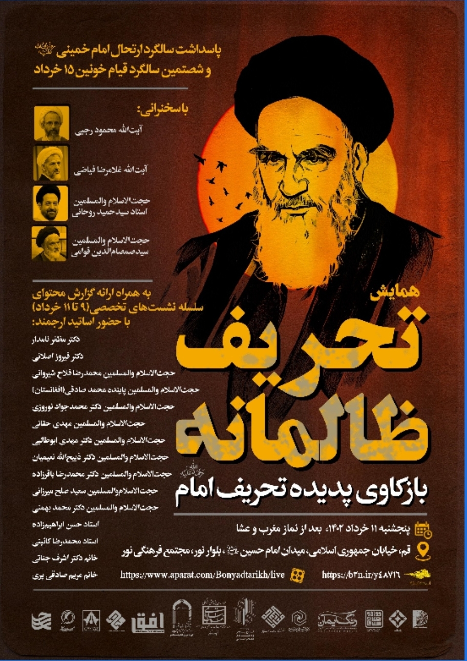 در آستانه سی و چهارمین سالگرد بزرگداشت ارتحال بنیانگذار جمهوری اسلامی ایران؛ حضرت امام خمینی قدس سره الشریف و شصتمین سالگرد قیام خونین 15خرداد بههمت جمعی از مراکز تخصصی و پژوهشی همایش «تحریف ظالمانه؛ بازکاوی پدیده تحریف امام» روز پنجشنبه 11 خرداد در مجتمع فرهنگی نور واقع در خیابان جمهوری اسلامی، میدان امام حسین، بلوار نور شهر مقدس قم برگزار میگردد.