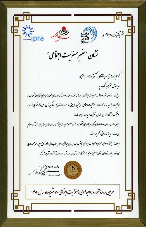 در متن لوح تقدیر و نشان سفیر مسئولیت اجتماعی خطاب به دکتر ابراهیمی مدیرعامل بانک سپه آمده است: