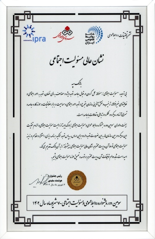 به گزارش پایگاه اطلاع رسانی بانک سپه، این بانک در سومین دوره جشنواره روابط عمومی و مسئولیت اجتماعی (برند خوب) که عصر روز سه شنبه ۷ شهریور ۱۴۰۲، با حضور روابط عمومی سازمان ها و شرکت های پیشرو در زمینه مسئولیت اجتماعی در مرکز همایش های بین المللی صداوسیما برگزار شد موفق به دریافت نشان عالی مسئولیت اجتماعی پیشرفته شد و نشان سفیر مسئولیت اجتماعی به پاس زمینه سازی و اهتمام در ترویج مسئولیت اجتماعی در بانک سپه به دکتر آیت اله ابراهیمی مدیرعامل بانک اهدا شد .