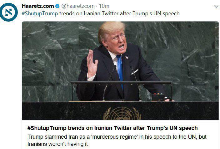 هاارتص اسرائيل نیز نوشت: هشتگ #ترامپ_خفه_شو در توییتر ایرانی ها ترند شد.