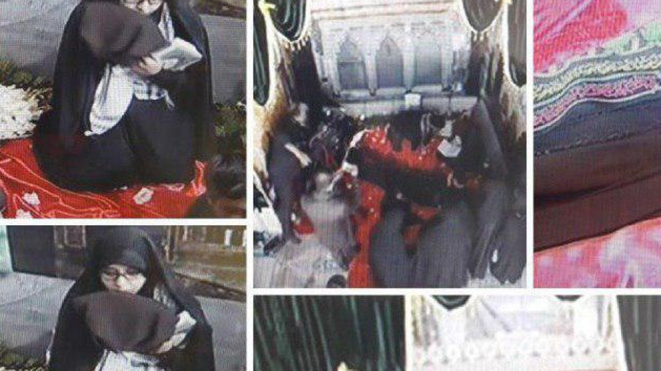هماکنون همسر شهید محسن حججی بر بالای مزار شهید در حال قرائت قرآن منتظر حضور همسرش نشسته است.