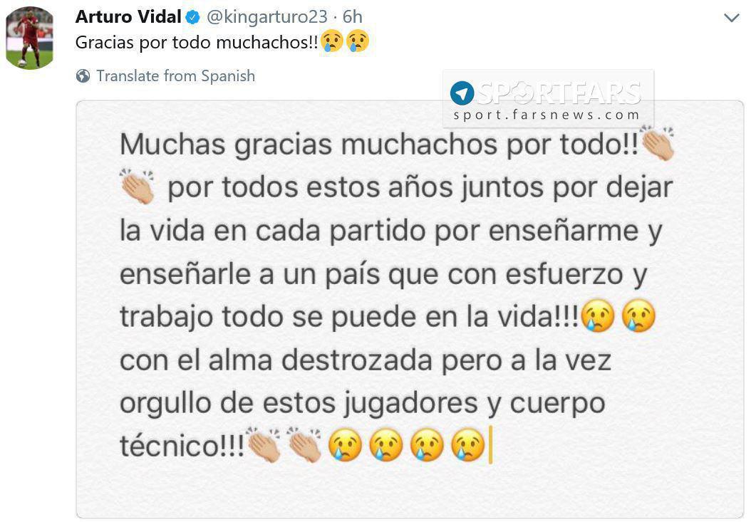 گروه ورزشی الف، 3960719152پس از آرین روبن، هافبک بایرن مونیخ نیز پس از ناکامی شیلی در راه رسیدن به جام جهانی 2018 روسیه از طریق توئیتر اقدام به خداحافظی کرد.