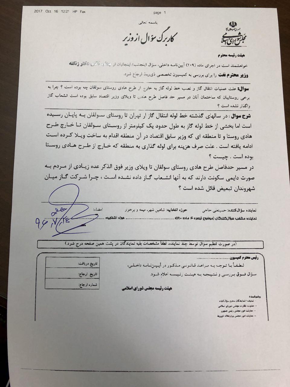 حسینعلی حاجی دلیگانی نماینده شاهین شهر در مجلس این سوال را از بیژن زنگنه تقدیم مجلس کرده است.