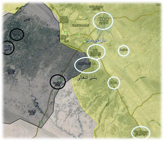 نقشه زیر موقعیت جغرافیایی شهر تازه خورماتو(شهری با بیش از 90% جمعیت شیعه)، منطقه بشیر و نیز شهرهای ترکمن نشین کرکوک،طوزخورماتو،داقوق و لیلان را نشان می دهد.به جز مناطق مسکونی روستای بشیر که در اردیبهشت سال گذشته آزاد شد، سایر مناطق با رنگ تیره هنوز تحت کنترل مستقیم داعش قرار دارند.(توضیح: تقریبا همه مناطق اشغالی در عملیات های سال جاری آزاد شده است)