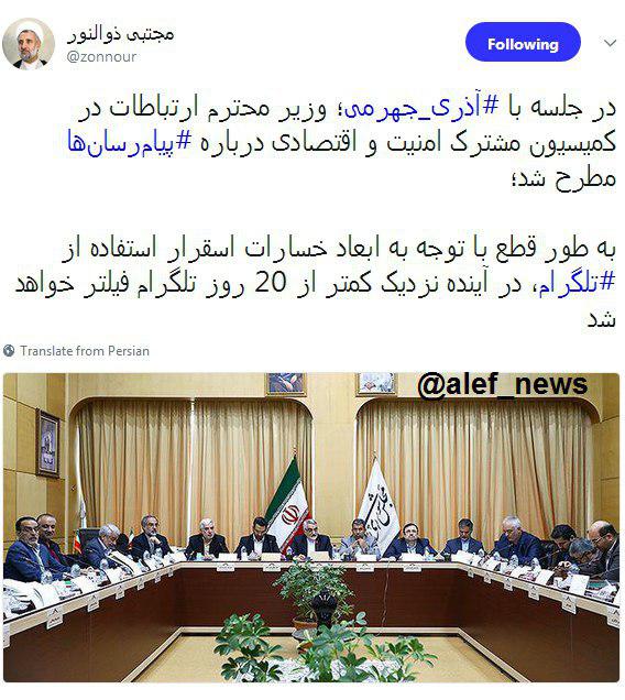 ذوالنور نماینده مجلس شورای اسلامی در توییتی خبر از فیلتر تلگرام در کمتر از بیست روز دیگر داد.