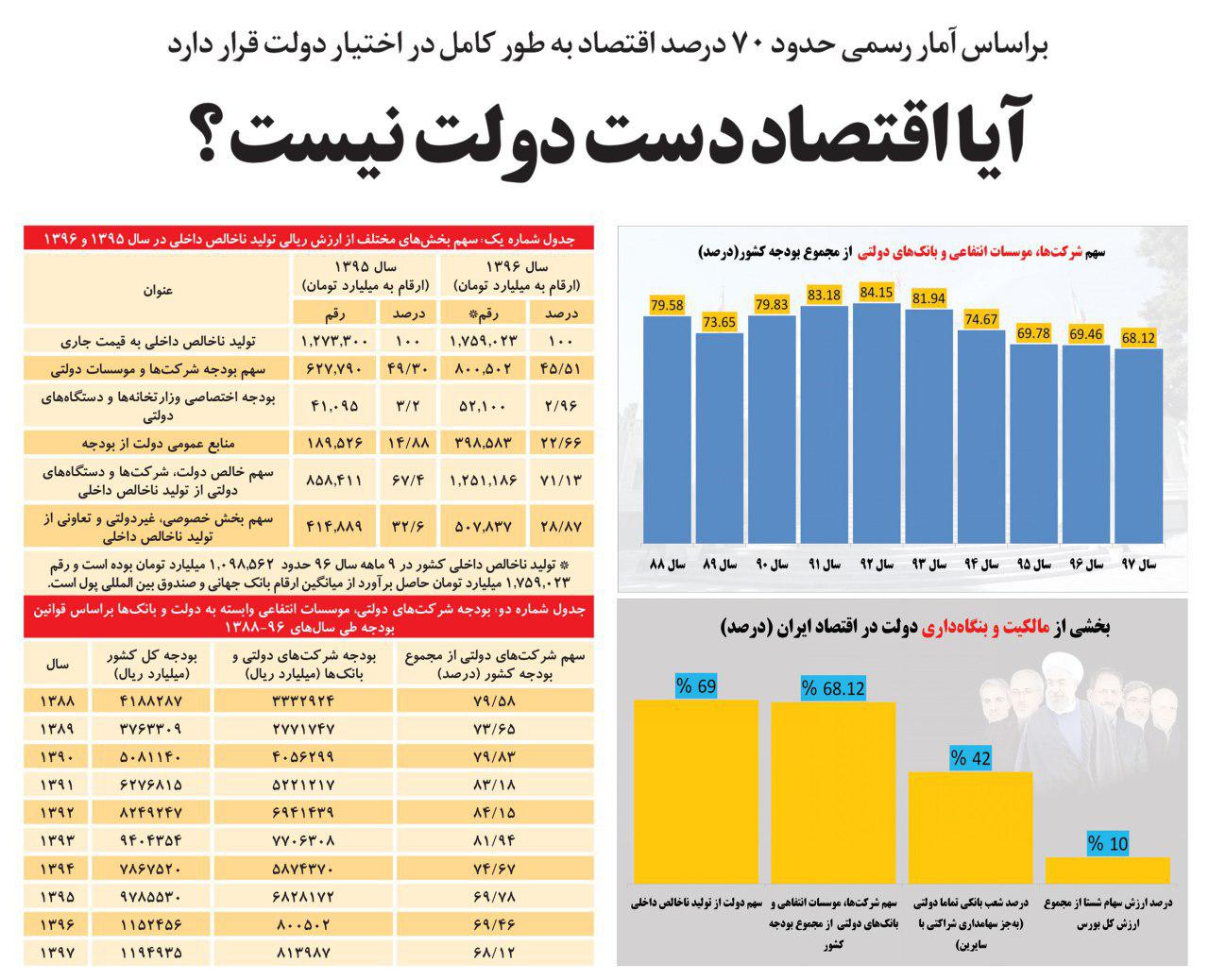 بررسی اعداد مربوط به مالکیت دولت در اقتصاد ایران نشان میدهد برخلاف برخی اظهارنظرهای سیاسی و غیرعلمی حدود ۷۰درصد از اقتصاد ایران در اختیار دولت است.