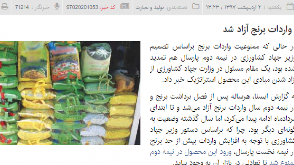 در این خبر آمده بود که بنا بر تصمیم مسئولان ارشد دولت، از امروز همه مبادی وارداتی برنج آزاد شده و وارد کنندگان تنها با رعایت شرایط و ضوابط سازمان استاندارد و وزارت بهداشت، درمان و آموزش پزشکی میتوانند نسبت به ورود این محصول استراتژیک از هر یک از مبادی رسمی کشور اقدام کنند.