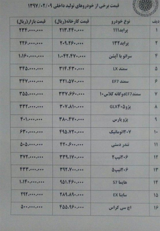 قیمت تعدادی از خودروهای داخلی در بازار امروز به شرح زیر است: