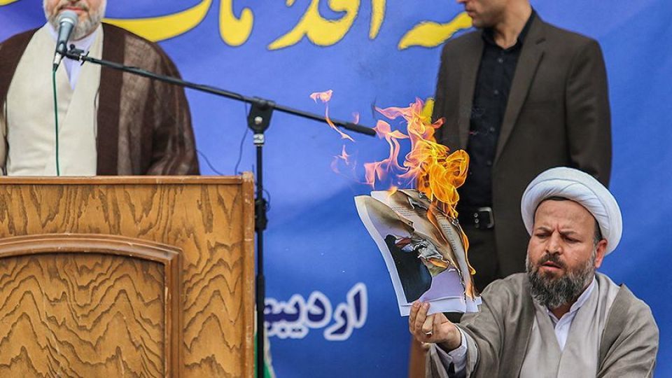 جمعی از طلاب، علماء و مراجع استان قم پیش از ظهر چهارشنبه ۱۹ اردیبهشت ۱۳۹۷ ضمن تجمع در مدرسه فیضیه قم اعتراض خود را نسبت به خروج آمریکا از برنامه جامع اقدام مشترک اعلام کردند.عکس: محسن کرمعلی/فارس