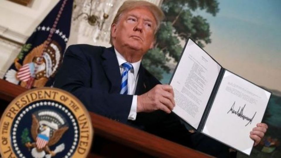 دونالد ترامپ، رئیسجمهور آمریکا بعد از ظهر سهشنبه به وقت محلی در یکی از سه اتاق پذیرش دیپلماتیک کاخ سفید در برابر دوربینها حاضر شد و رسما اعلام کرد که «ایالات متحده از قرارداد هستهای ایران خارج خواهد شد و تحریمهای مربوط با موضوع هستهای ایران را مجددا از سر خواهد گرفت.» ترامپ در حالی که با انگشتانش به خبرنگاران و عکاسان خبری اشاره میکرد مدعی شد «این (خروج از برجام) باعث میشود که آمریکا امنتر شود.»