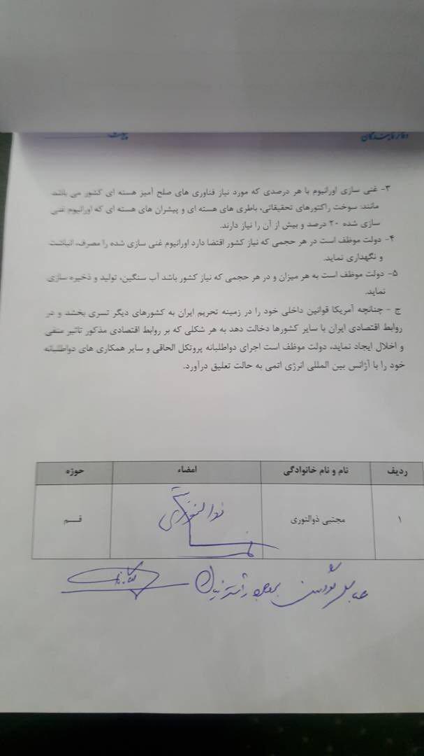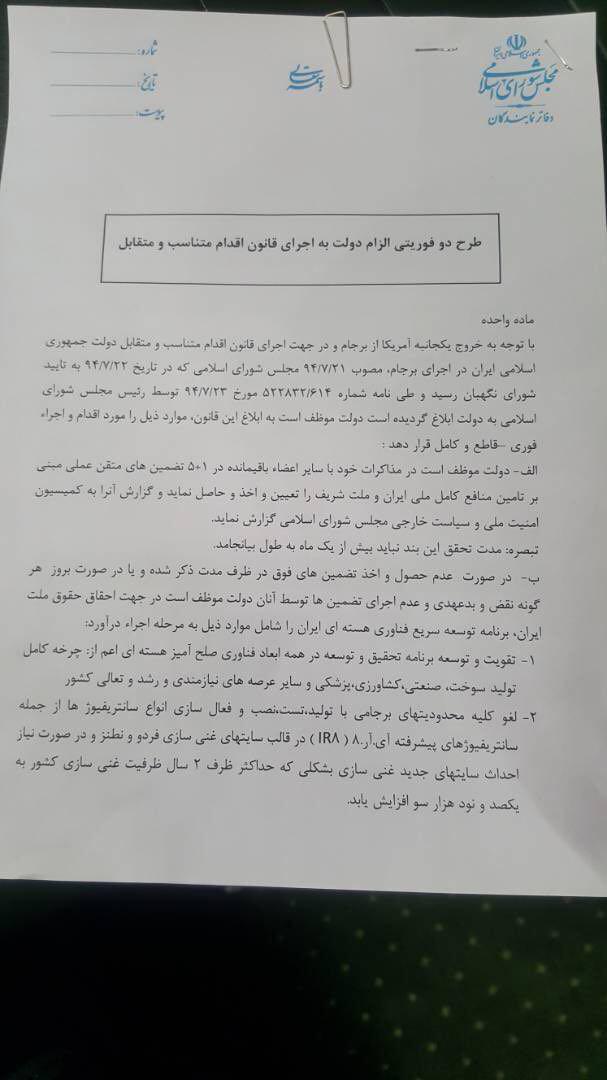 الف- دولت موظف است در مذاکرات خود با سایر اعضای باقیمانده در 1+5 تضمین های متقن عملی مبنی بر تامین منافع کامل ملی ایران و ملت شریف را تعیین و اخذ و حاصل نماید و گزارش آنرا به کمیسیون امنیت ملی و سیاست خارجی مجلس شورای اسلامی گزارش نماید.