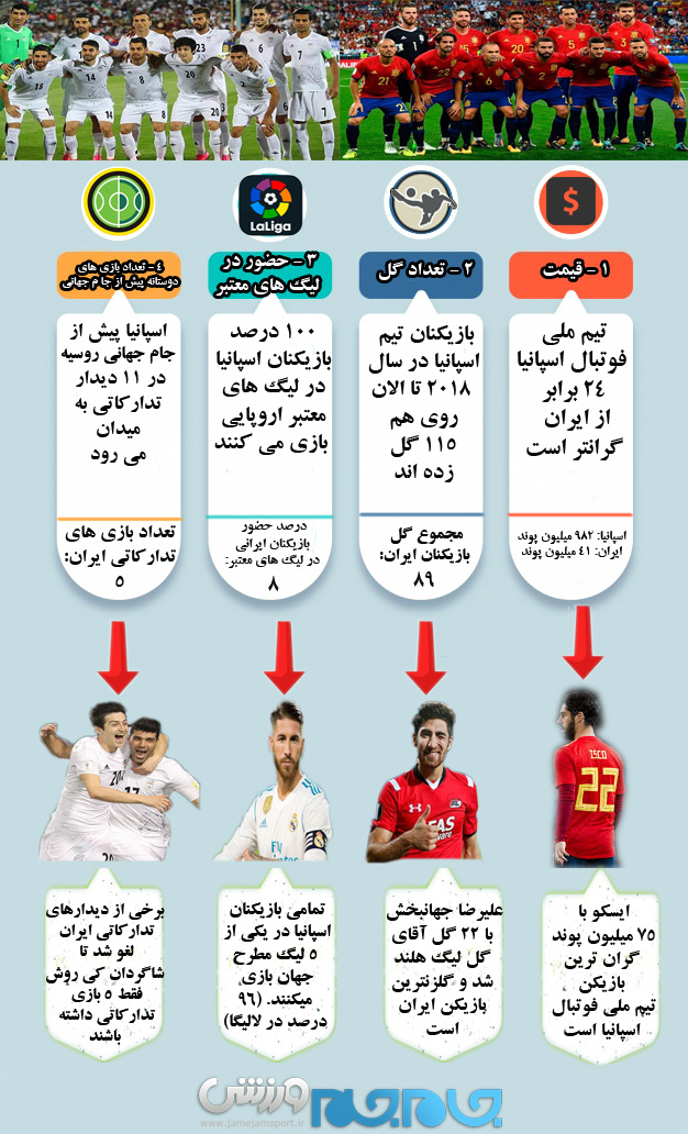 * تمامی بازیکنان تیم ملی فوتبال اسپانیا در یکی از 5 لیگ معتبر جهان بازی می کنند. سری آ ایتالیا، لیگ برتر انگلیس، لالیگای اسپانیا، بوندسلیگای آلمان و لوشامپیونه فرانسه 5 لیگ معتبر فوتبال دنیا هستند. 96 درصد بازیکنان اسپانیا در همان لالیگا بازی می کنند. شاخص ترین بازیکنی از اسپانیا که در خارج از این کشور بازی می کند آلوارو موراتا است که در چلسی به میدان می رود. اما هیچ کدام از بازیکنان تیم ملی ایران در 5 لیگ معتبر اروپایی حضور ندارند. رضا قوچان نژاد و علیرضا جهانبخش اما در لیگ هلند که ششمین لیگ مطرح و معتبر فوتبال جهان محسوب می شود بازی می کنند. لیگ های بلژیک و یونان که بازیکنان ایرانی در آنها بازی می کنند در این ارزیابی محسوب نمی شوند.