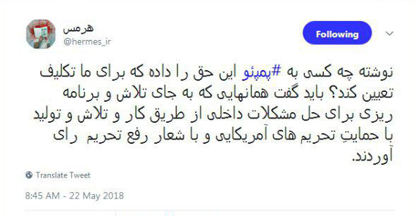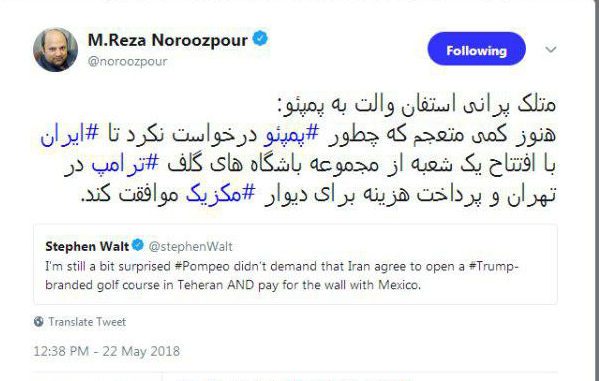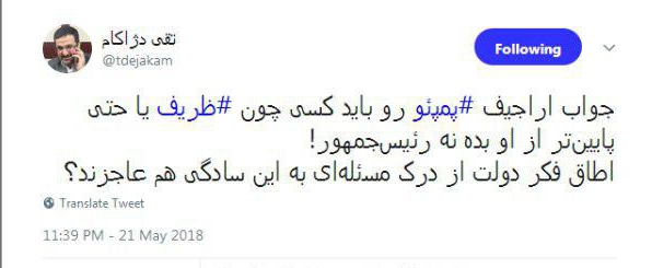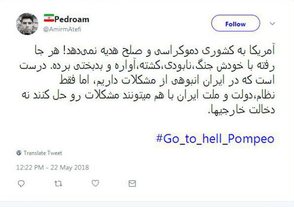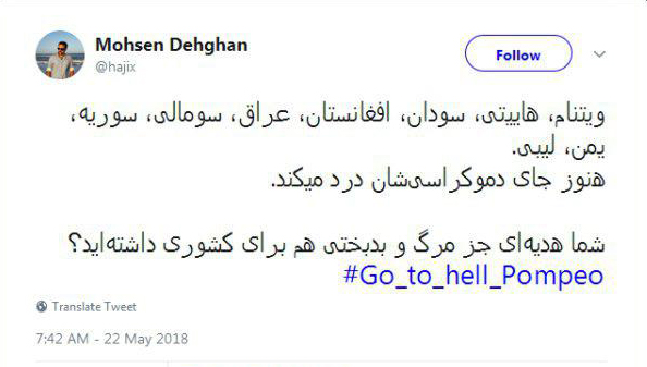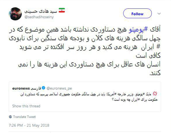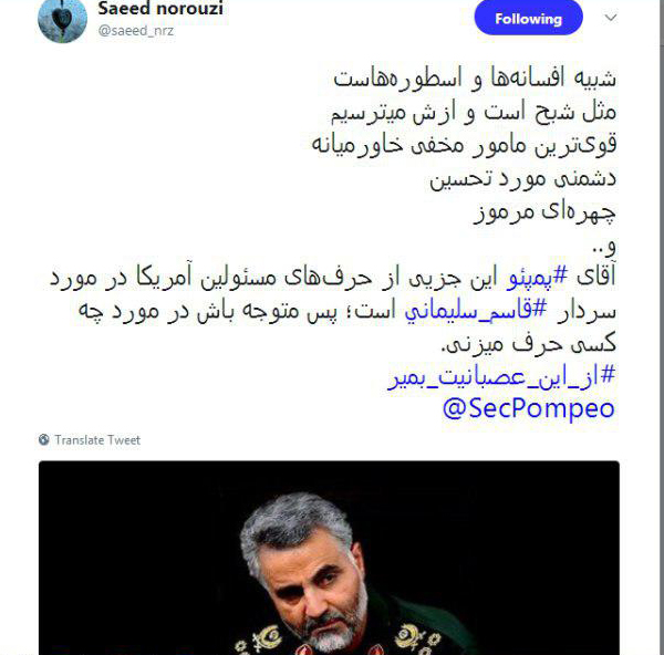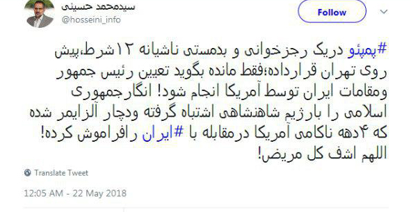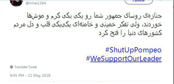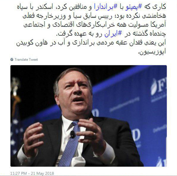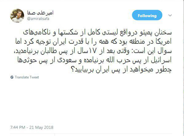به گزارش الف، وزیر خارجه آمریکا در اندیشکده «هریتیج» حاضر شد تا از راهبرد این کشور در قبال ایران پس از خروج از توافق هستهای رونمایی کند و ضمن تشریح مسیر دیپلماتیک جدید آمریکا در قبال ایران و تهدید به اعمال فشارهای مالی بیسابقه، ۱۲ سرفصل خواستههای واشنگتن از تهران را عنوان کرد. او همچنین ادعاهایی بیاساس علیه سردار سلیمانی بیان کرد. در ادامه واکنش های توییتری به اظهارات مایک پمپئو علیه ایران را میخوانید.